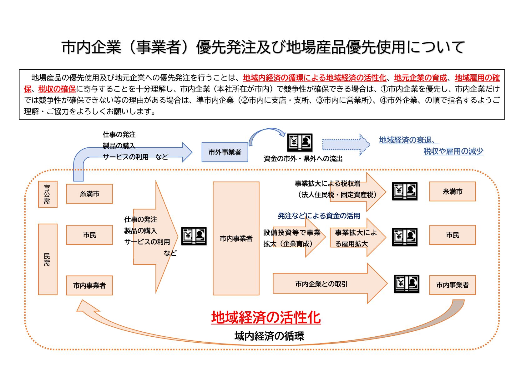 市内企業への優先発注や地場産品を優先使用することにより、域内経済の循環による地域経済の活性化、地元企業の育成、地域雇用の確保、税収の確保に寄与することを十分に理解し、公共工事や業務の発注等においては、市内企業の受注機会の確保を図っていきます。